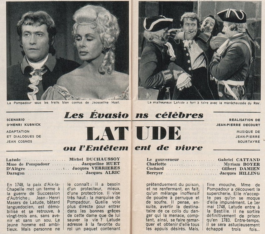 - En ouverture, un joli ratage ! En effet, il était donc prévue la série "Les Evasions Célèbres" (avec l’épisode "Latude ou l’Entêtement de Vivre", réalisé, en 1972 par Jean-Pierre Decourt, et interprété par Michel Duchaussoy). Mais, c’était sans compter sur les coupures ! En résumé, un événement malheureux qui se reproduira plus tard au cours de cette première saison. Aussi, la diffusion initialement annoncée fût-elle empêchée.